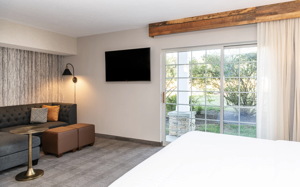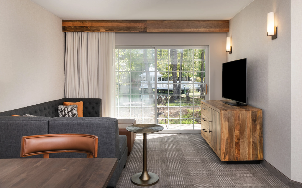 Single King rooms feature a living area with a dining table & chairs and a large dresser. Single King rooms offer Main Courtyard, Cascade Courtyard, and lawn views. Guests in Single King rooms can also enjoy soaking in the large garden tub.